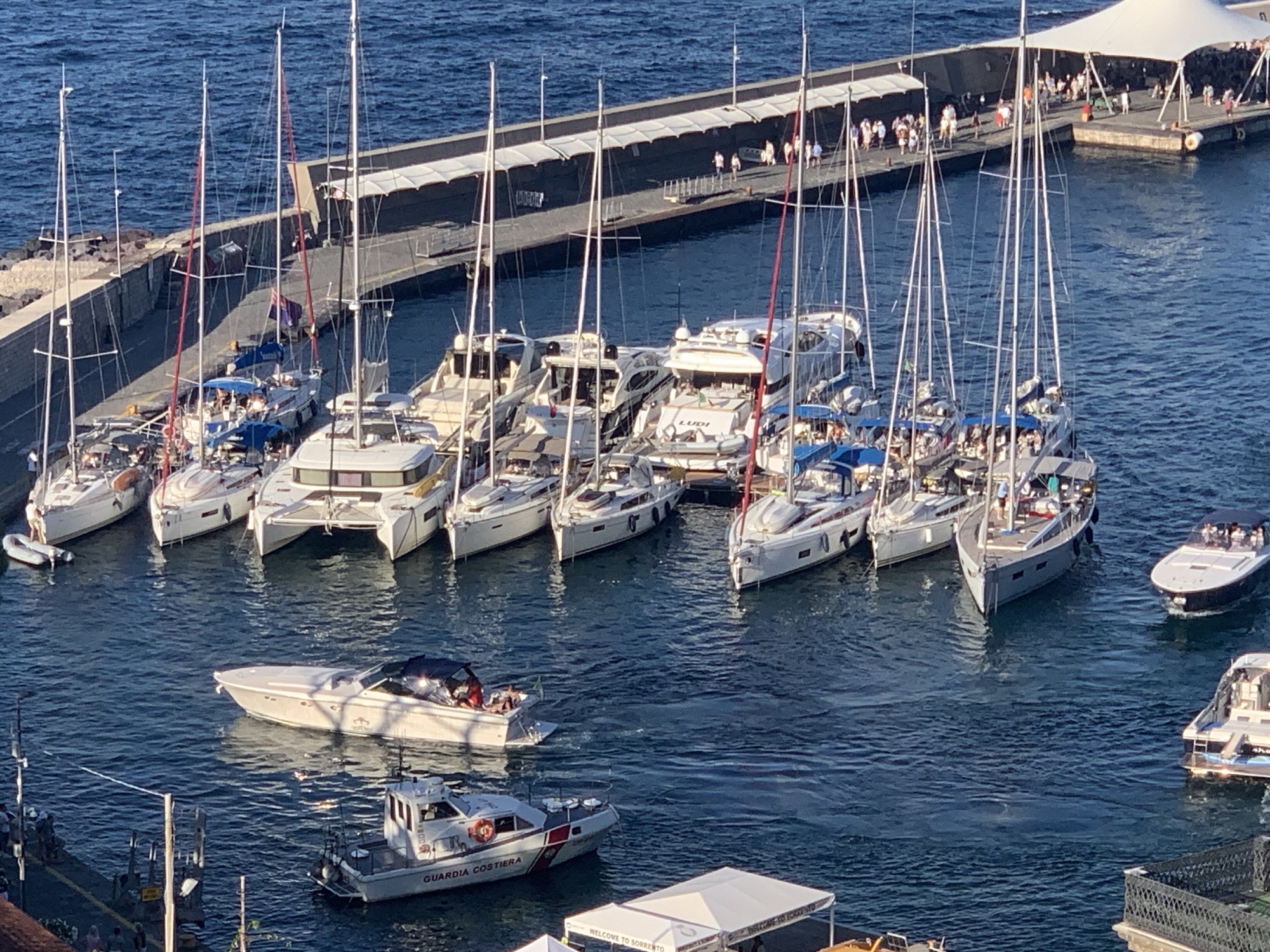 Am Montag trafen schließlich alle Yachten wieder zusammen und segelten gemeinsam entlang der eindrucksvollen Steilküste bis nach Sorrent. Dort konnten für alle Schiffe Liegeplätze organisiert werden – und hier entstand auch das Gruppenfoto, das diesen gelungenen Segeltag festhält. Nach einem geselligen Abend in der Altstadt von Sorrent stand am Dienstag das nächste Ziel fest: die berühmte Insel Capri.